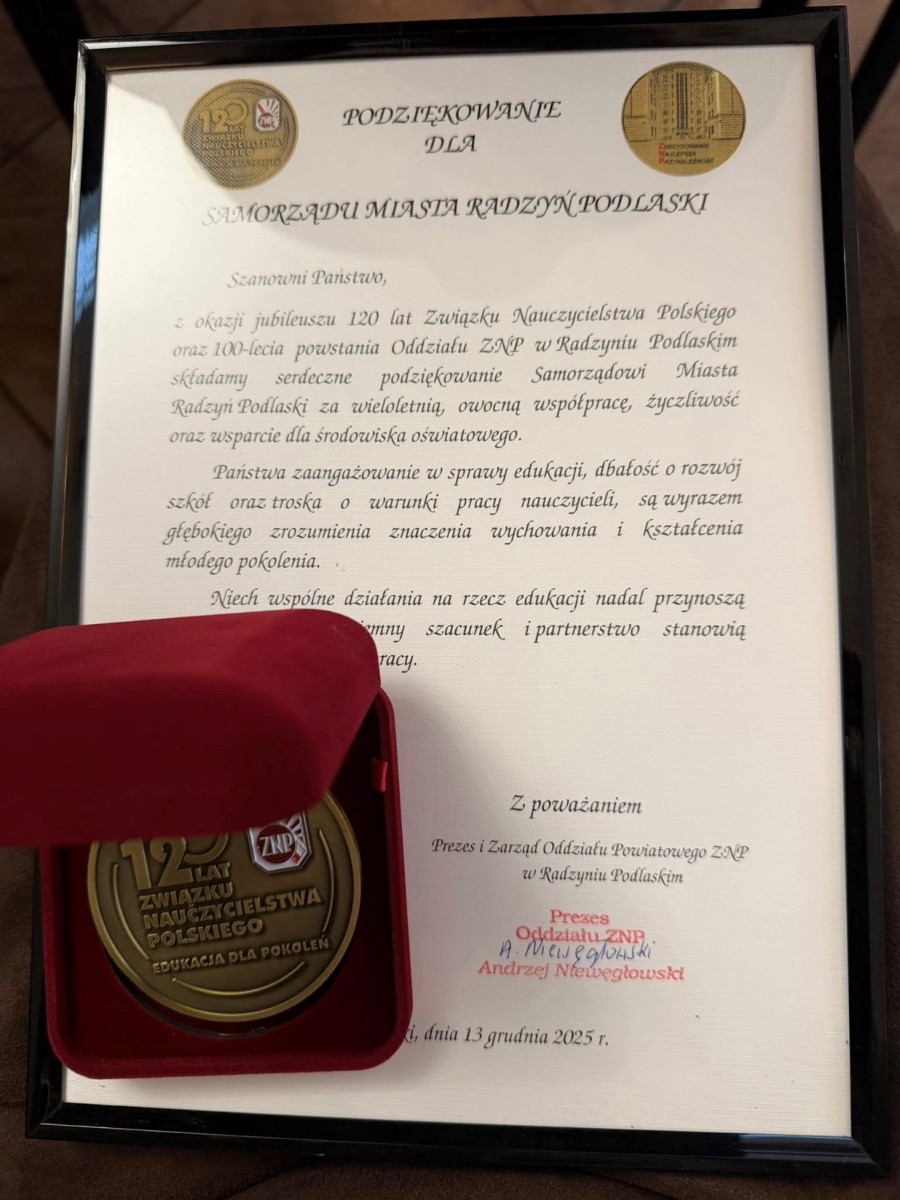 W sobotę 13.12 w Świetlicy Wiejskiej w Białej obchodzone było 120-lecie Związku Nauczycielstwa Polskiego oraz 100-lecie Oddziału ZNP w Radzyniu Podlaskim. Reprezentująca Burmistrza Miasta Radna Agnieszka Kowalczyk, Przewodnicząca Komisji Oświaty i Kultury, odebrała podziękowania za wieloletnią, owocną współpracę.