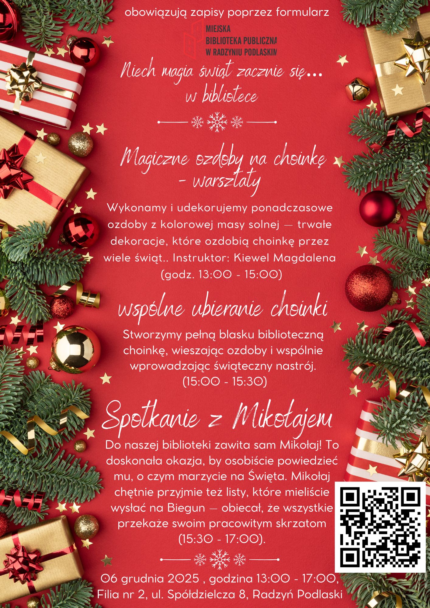 W sobotę 6 grudnia od godziny 13:00 Miejska Biblioteka Publiczna zaprasza dzieci na popołudnie pełne świątecznej magii. Nie może Was zabraknąć, bo w programie mnóstwo atrakcji. W Filii nr 2 przy ul. Spółdzielczej 8 odbędą się kreatywne warsztaty ozdób choinkowych, wspólne dekorowanie bibliotecznego drzewka oraz długo wyczekiwana wizyta Mikołaja, któremu będzie można wręczyć listy. Obowiązują zapisy przez formularz.