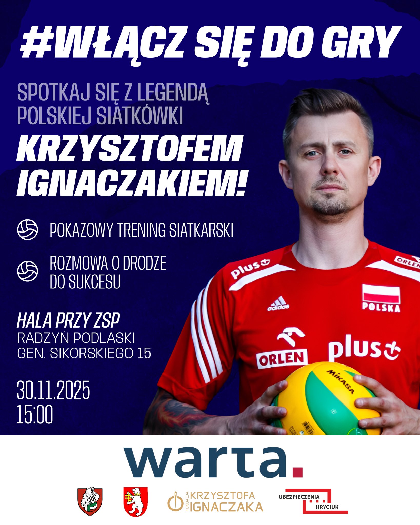 30 listopada o 15:00 w hali przy Zespole Szkół Ponadpodstawowych w Radzyniu Podlaskim odbędzie się spotkanie z Krzysztofem Ignaczakiem - siatkarzem, libero, mistrzem świata (2014), olimpijczykiem z Aten (2004), Pekinu (2008) i Londynu (2012).