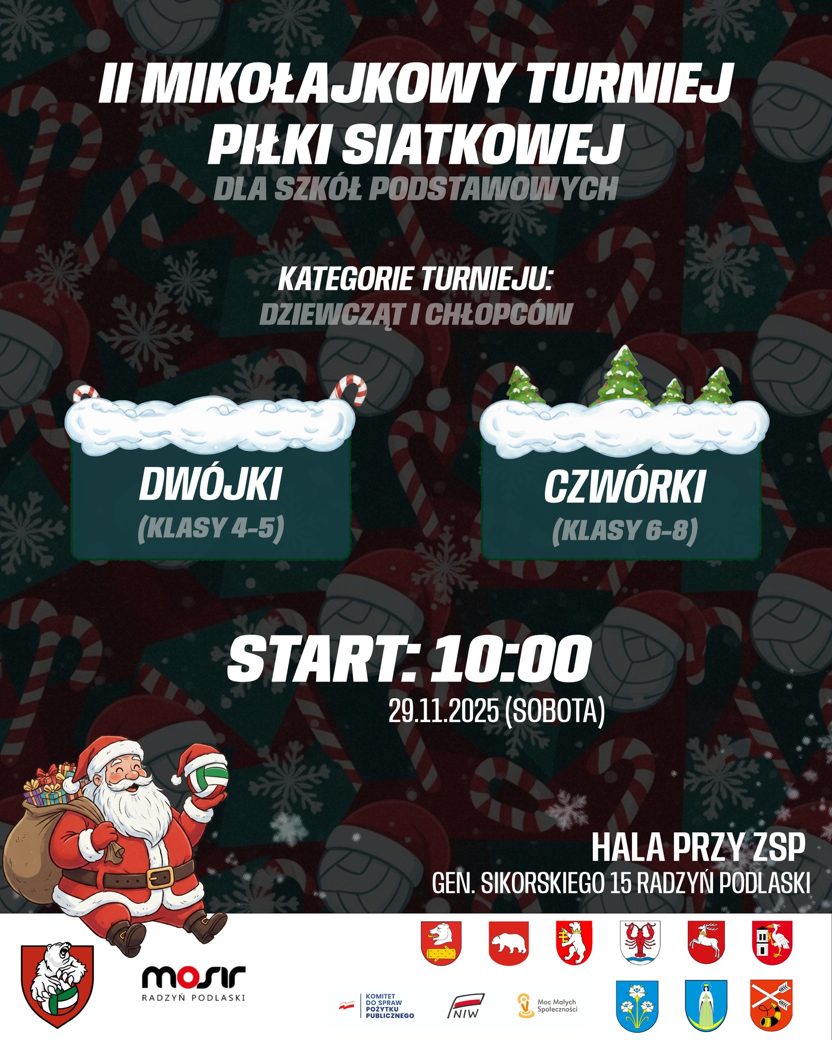Radzyński Klub Sportowy Ubezpieczenia Hryciuk Radzyń Podlaski wspólnie z Miejskim Ośrodkiem Sportu i Rekreacji zapraszają na 2. Mikołajkowy Turniej Piłki Siatkowej dla Szkół Podstawowych, który odbędzie się 29 listopada o godzinie 10:00 na hali sportowej Zespołu Szkół Ponadpodstawowych im. Jana Pawła II w Radzyniu Podlaskim.