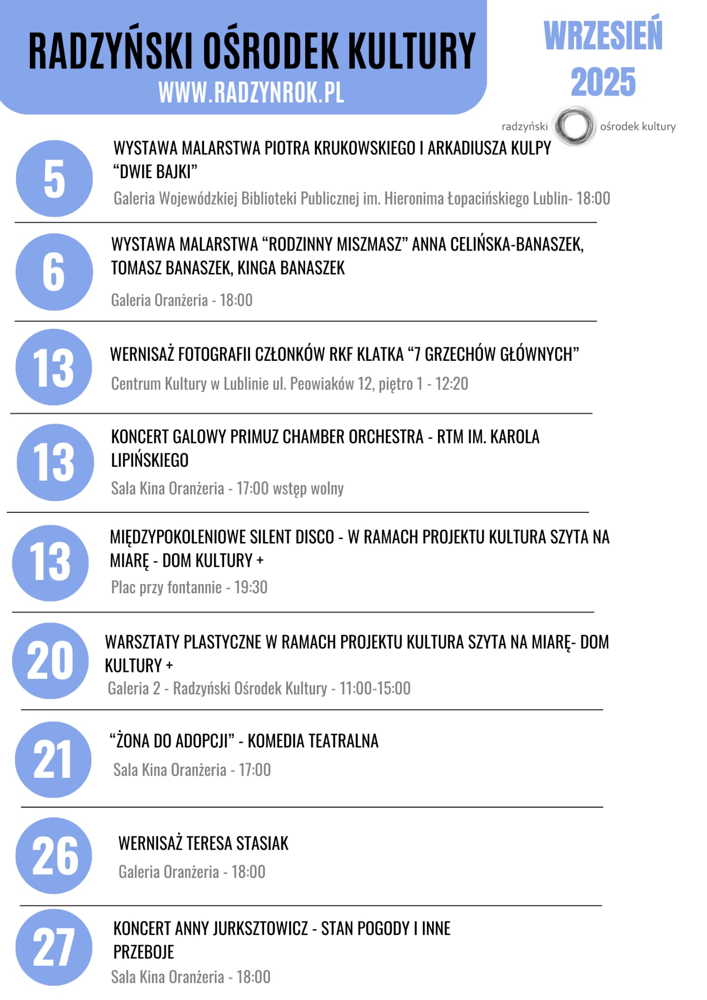 Radzyński Ośrodek Kultury przedstawia harmonogram wrześniowych wydarzeń. Zapraszamy do zapoznania się i skorzystania z oferty.