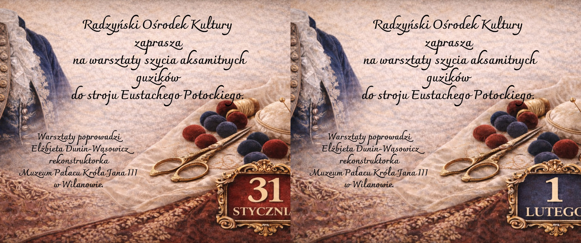 W sobotę 31 stycznia i w niedzielę 1 lutego o 11:00 Radzyński Ośrodek Kultury w związku z realizacją projektu KPO Kultura „Pałac Potockich: od zgliszczy do wirtualnej rzeczywistości” zaprasza na wyjątkowe, bezpłatne warsztaty. W trakcie zajęć z Elżbietą Dunin-Wąsowicz z Muzeum Pałacu Króla Jana III w Wilanowie, wykonanych zostanie 40-50 aksamitnych guzików do replik strojów Marianny i Eustachego Potockich. W warsztatach mogą wziąć udział chętni w każdym wieku. Nie trzeba mieć doświadczenia w szyciu. Zapisy w sekretariacie Radzyńskiego Ośrodka Kultury. Liczba miejsc ograniczona.