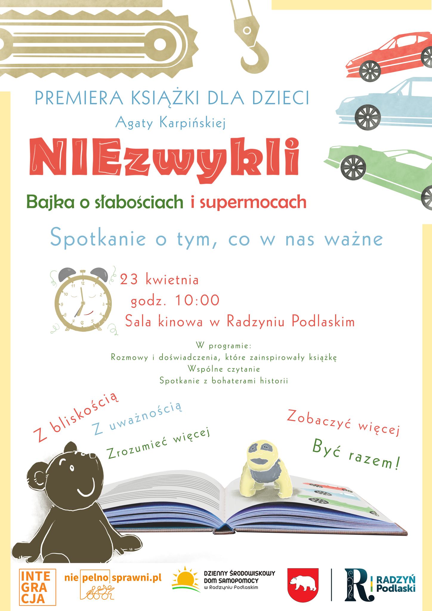 Miasto Radzyń Podlaski oraz Dzienny Środowiskowy Dom Samopomocy w Radzyniu Podlaskim patronują premierze książki dla dzieci Agaty Karpińskiej „NIEzwykli. Bajka o słabościach i supermocach”. Spotkanie z autorką odbędzie się 23 kwietnia, w Światowym Dniu Książki. Jak zapowiada autorka, będzie to opowieść o zabawkach, które tuż przed wiosennymi porządkami obawiają się, że nie zostaną wybrane, bo nie są wystarczająco atrakcyjne lub mają swoje niedoskonałości.