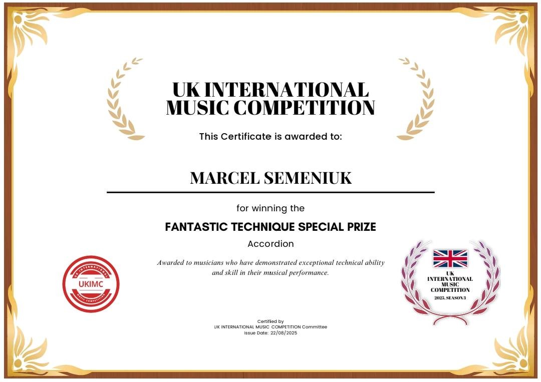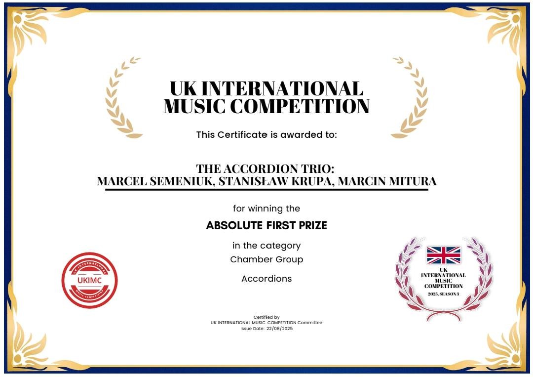 Podczas United Kingdom International Music Competition – Międzynarodowego Konkursu Muzycznego w Wielkiej Brytanii – najwyższe wyróżnienie Absolute First Prize (Grand Prix) zdobyło Trio w składzie: Marcel Semeniuk, Stanisław Krupa oraz Marcin Mitura.