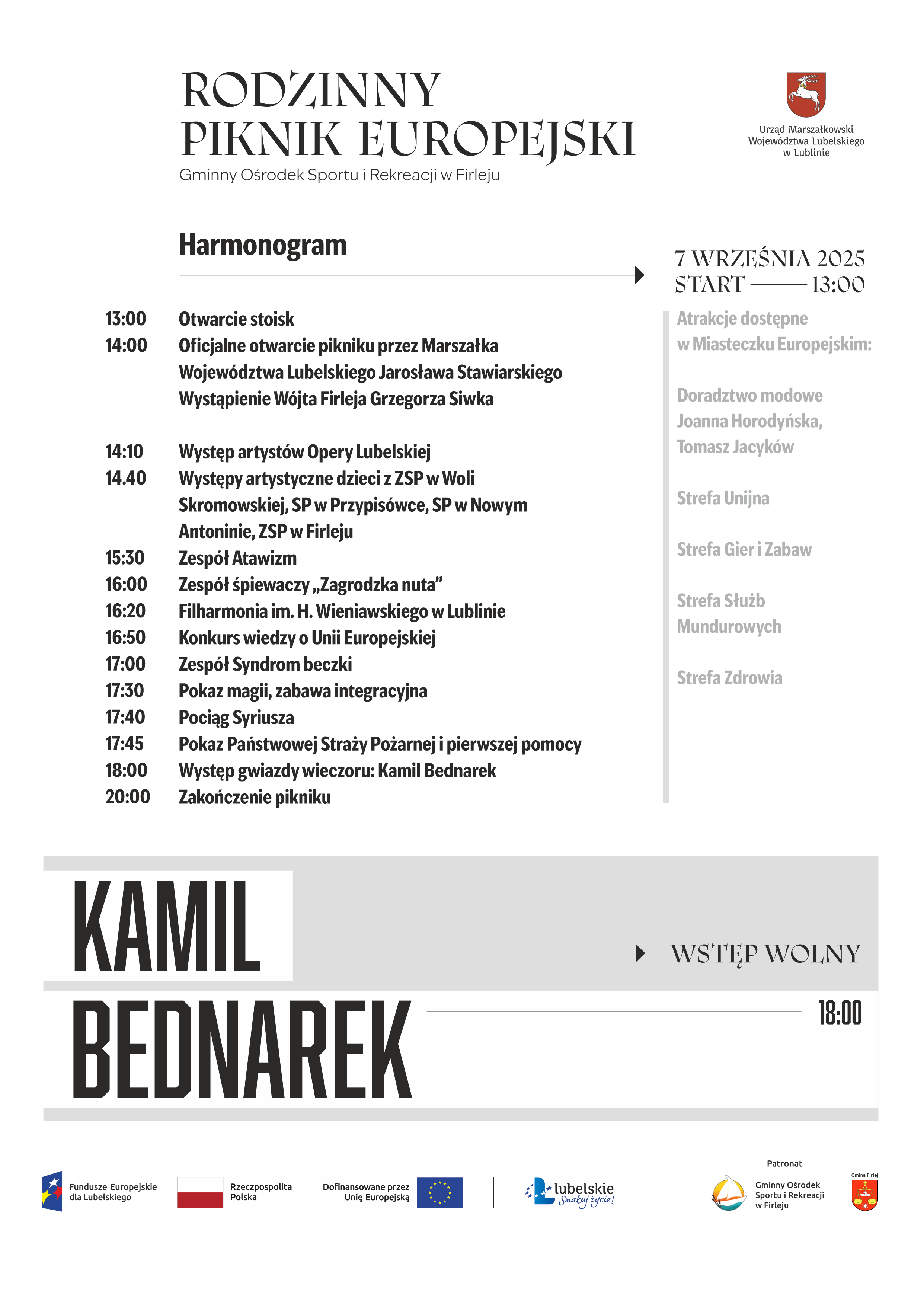Urząd Marszałkowski Województwa Lubelskiego w Lublinie zaprasza na Rodzinny Piknik Europejski, który odbędzie się 7 września br. w godz. 13.00-20.00 na terenie Gminnego Ośrodka Sportu i Rekreacji przy ul. Choiny 1 w Firleju. Uroczyste otwarcie Pikniku przez Marszałka Województwa Lubelskiego Jarosława Stawiarskiego nastąpi o godz. 14.00.