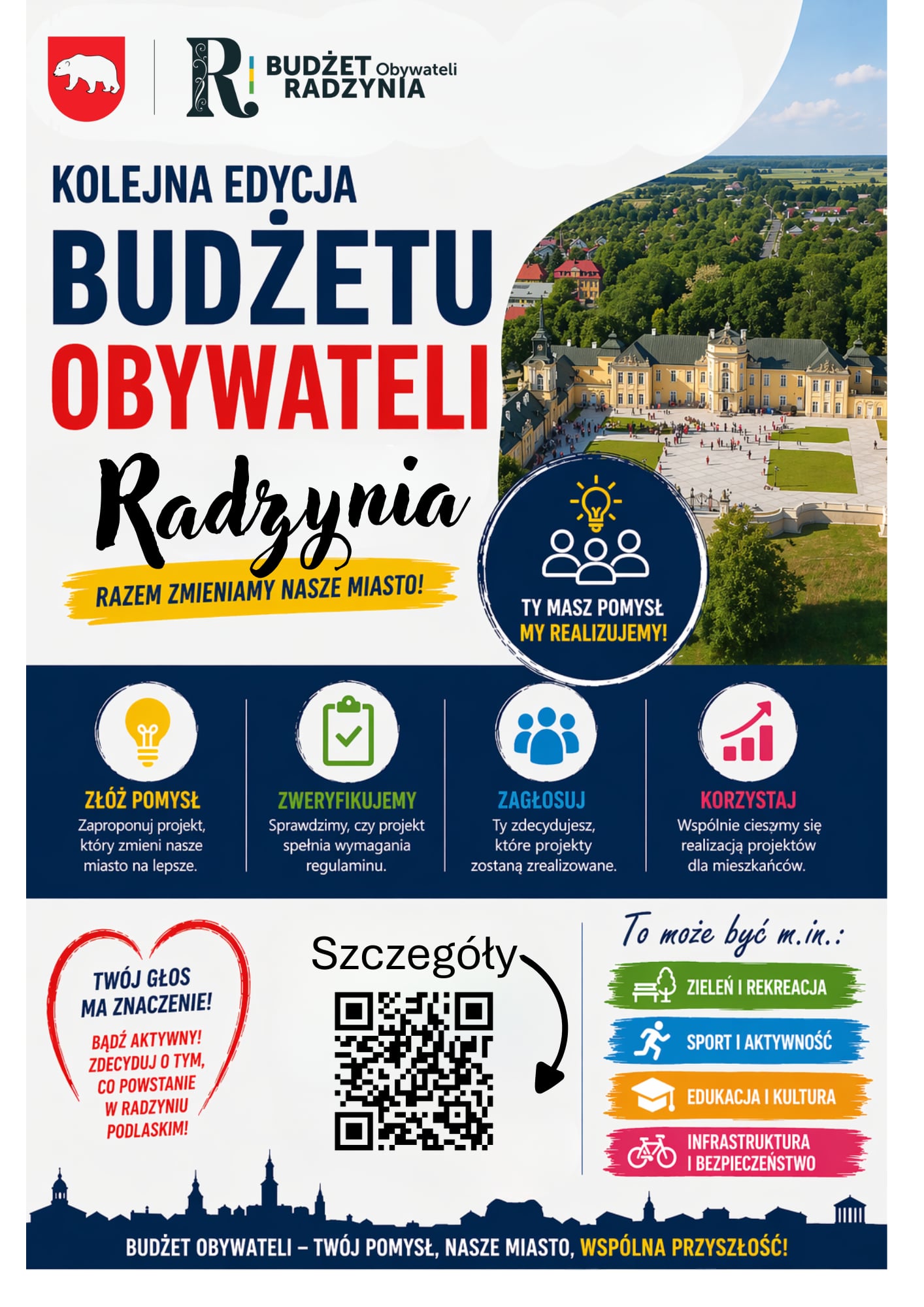 Burmistrz Miasta Radzyń Podlaski informuje, że w dniu 30 marca 2026 r. do Urzędu Miasta Radzyń Podlaski wpłynęła oferta na realizację zadania publicznego pt, ,,Spędzanie wolnego czasu na świeżym powietrzu - rehabilitacja" w zakresie działalności rozwijającej wspólnoty i społeczności lokalne, złożona przez Stowarzyszenie Emerytów i Rencistów ,,Kormoran" z siedzibą przy ul. Jana Pawła II 2/2, 21-300 Radzyń Podlaski. Oferta w dniu 7 kwietnia 2026 r. została opublikowana w Biuletynie lnformacji Publicznej [link do oferty].