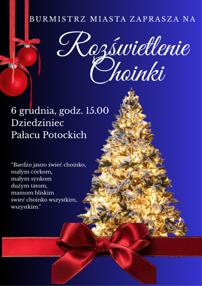 Burmistrz Miasta Jakub Jakubowski zaprasza na wspólne rozświetlenie choinki - już w sobotę 6 grudnia 2025 r. o godz. 15.00 na dziedzińcu Pałacu Potockich.