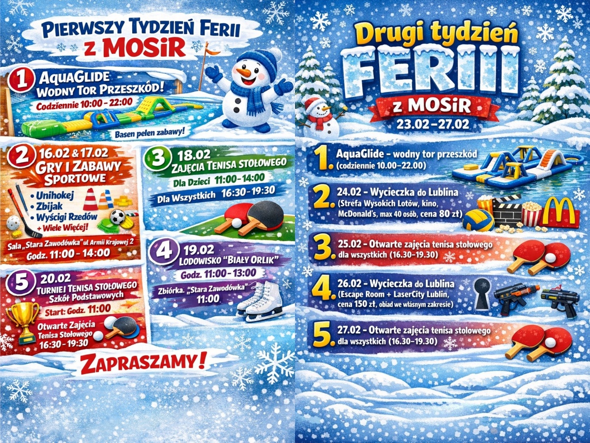 Wodny tor przeszkód, sportowe wyzwania, gry i zabawy ruchowe, a do tego wycieczki do Lublina. Taką propozycję przygotował Miejski Ośrodek Sportu i Rekreacji w Radzyniu Podlaskim na nadchodzące ferie zimowe. Dokładny harmonogram znajduje się na grafice.